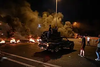En la mañana del 18 de octubre, los manifestantes en Nabatiyeh y Trípoli atacaron las oficinas de varios partidos políticos: Hezbolá, Movimiento Amal y Movimiento Patriótico Libre.[44][45][46]​ Otros manifestantes intentaron ingresar al Serail, que incluye el edificio del Parlamento del Líbano, pero fueron detenidos por el uso de gases lacrimógenos de las Fuerzas Armadas del Líbano.[47]​ Los manifestantes crearon bloqueos de carreteras en las principales carreteras del país, utilizando neumáticos en llamas y botes de basura para detener el acceso.[48][49]