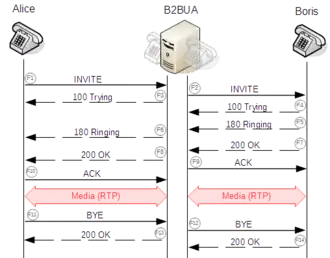 Un usuario ingresa la dirección lógica de la persona con la que quiere comunicarse, puede indicar al terminal también la característica de la sesión que quiere establecer (voz, voz y video, etc.), o estas pueden estar implícitas por el tipo de terminal del que se trate. El agente de usuario SIP que reside en el terminal, actuando como UAC envía la petición (en este caso con el método INVITE) al servidor que tiene configurado. Este servidor se vale del sistema DNS para determinar la dirección del servidor SIP del dominio del destinatario. El dominio lo conoce pues es parte de la dirección lógica del destinatario. Una vez obtenida la dirección del servidor del dominio destino, encamina hacia allí la petición. El servidor del dominio destino establece que la petición es para un usuario de su dominio y entonces se vale de la información de registro de dicho usuario para establecer su ubicación física. Si la encuentra, entonces encamina la petición hacia dicha dirección. El agente de usuario destino si se encuentra desocupado comenzará a alertar al usuario destino y envía una respuesta hacia el usuario origen con un código de estado que indica esta situación (180 en este caso). La respuesta sigue el camino inverso hacia el usuario origen. Cuando el usuario destino finalmente acepta la invitación, se genera una respuesta con un código de estado (el 200) que indica que la petición fue aceptada. La recepción de la respuesta final es confirmada por el UAC origen mediante una petición con el método ACK (de Acknowledgement), esta petición no genera respuestas y completa la transacción de establecimiento de la sesión.