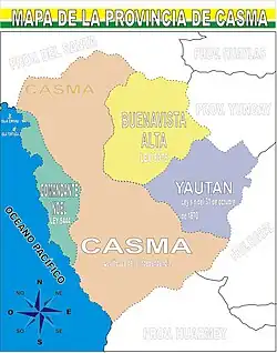 - ↑ «Casma celebra sus 64 años de creación política». peru.com. 14 de abril de 2014. Consultado el 27 de marzo de 2017.