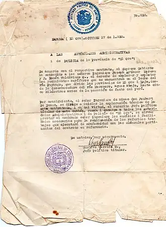 Durante las dictaduras de los años 30, se autorizó la exploración y explotación de los yacimientos auríferos en el río Puyango, a compañías mineras norteamericanas. Uno de estos ingenieros, Joubert de Deaux, fue el primer estadounidense en explorar el río Puyango desde la desembocadura del río Moromoro hasta la frontera con Perú.