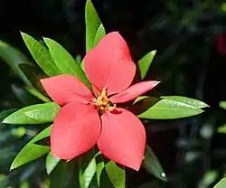 El Jazmín del Pinar (Euphorbia podocarpirolia), de pétalos rojos y hojas alargadas, fue declarado Flor de Holguín en octubre de 1988 por su belleza, exclusividad regional y valor cultural. Descubierta en 1909 en Pinares de Mayarí, fue seleccionada por especialistas del Ministerio de Ciencia, Tecnología y Medio Ambiente, entre cinco especies con características similares. Esta planta endémica forma parte del escudo provincial y, según la historia, su látex fue usado por los mambises contra soldados españoles. Pertenece a la misma familia de la Pascua y la Cardona, por lo que debe manejarse con cuidado.