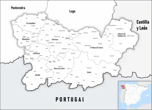 Orense (oficialmente en gallego: Ourense)[2] es una provincia del noroeste de España, situada en la parte sureste de la comunidad autónoma de Galicia. Limita con las provincias de Pontevedra al oeste, Lugo al norte, León y Zamora al este, y con Portugal (Distrito de Braganza, Distrito de Vila Real, Distrito de Braga y Distrito de Viana do Castelo) al sur. Su capital es la ciudad de Orense.