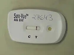 Una prueba de embarazo es toda aquella técnica usada para la búsqueda de los signos hipotéticos que permiten confirmar un embarazo. Consiste en detectar la presencia de la hormona gonadotropina coriónica humana (hCG) en el plasma materno o en la orina, y es el procedimiento que aporta quizá el mayor nivel de probabilidad de diagnóstico confiable. Esta hormona hipofisiaria, junto con la TSH, LH y FSH, cuenta con una estructura de dos subunidades: alfa y beta. La subunidad beta (β) es variable en todas ellas. La alta fiabilidad de la prueba de embarazo, se debe a la detección de la subunidad beta (β) de la hCG, totalmente única para esta hormona y no común al resto. Cuando es realizada la prueba de embarazo y una de las rayas es casi invisible esto significa negativo ya que para que se pueda comprobar que es positivo las 2 rayas deberían de estar completamente marcadas y coloridas