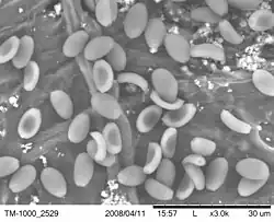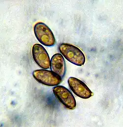 Un estudio posterior de especímenes recogidos en la Columbia Británica, Canadá, informó en cambio de un rango de tamaño de esporas mayor, de 10-13 por 6-7 μm. Las esporas tienen un poro germinal apical.[cita requerida]