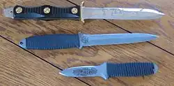 - ↑ Burton, Walter E., Knives For Fighting Men, Popular Science, July 1944, Vol. 145 n.º 1, p. 150: The dagger is classified as a type of fighting knife, while a combat knife is a knife specifically designed for military use, and is thus only certain types of daggers designed for military use are considered to be combat knives. Thus, an ordinary dagger designed for civilian sale and use is only a fighting knife, while the U.S. Army M3 trench knife is both a combat knife and a fighting knife.