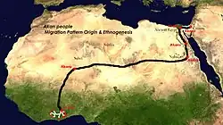La tradición oral de la comunidad akan relata una travesía de los nta fo (así llaman a sus ancestros) desde regiones más al norte de sus actuales emplazamientos.[9]​ Algunas versiones remiten al valle del Nilo[27]​, otras a las mesetas del Sudán[24]​ y también se menciona el “gran desierto blanco”.[7]​ Investigaciones etnográficas de la década de 1960 encontraron similitudes entre conceptos y deidades akánicas con las del Egipto faraónico.[28]​ En este recorrido que pudo iniciarse entre el año 2000 al 1500 a. C., habría una escala e integración con los habitantes del antiguo reino de Ghana, que pudo tener lugar entre los siglos IV y VII d. C., incluso hasta el XIII.[1][29]​ Así lo entienden investigaciones que encontraron que mandingas y akanes comparten nombres vinculados al antiguo reino, así como la tradición matrilineal de transmisión del linaje.[30][31]​ La invasión almorávide del siglo XI pudo provocar una nueva oleada de pequeñas comunidades que escaparon hacia territorios del bosque tropical y la costa de Guinea, futuro territorio akan.[1]