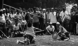 Lathi jela (lucha con palos) fue históricamente un método de duelo, como una forma de proteger o tomar la tierra y las posesiones de otros. Los Zamindars de Bengala contratarían "lathial" (luchadores de palos entrenados) como una forma de seguridad y un medio para recaudar impuestos a la fuerza de los inquilinos rebeldes.[67] Las competiciones nacionales de lathi jela solían tener lugar anualmente en Kushtia hasta 1989, aunque su práctica ahora está disminuyendo y restringidos a ciertos festivales y celebraciones.[68] Chamdi es una variante de lathi jela que es popular en el norte de Bengala. Palwani o kushti (lucha) también es otro deporte de lucha popular y ha desarrollado formas regionales como boli jela, que fue introducido en 1889 por Zamindar Qadir Bajsh de Chitagong. Un comerciante conocido como Abduljabbar Sawdagar adaptó el deporte en 1907 con la intención de cultivar un deporte que preparara a los bengalies en la lucha contra los colonos británicos.[69][70] En 1972, Un popular deporte de equipo llamado Kabaddi se convirtió en el deporte nacional de Bangladés. Es una versión regulada del deporte rural Hadudu que no tenía reglas fijas. Butthan, un arte marcial bengalí del siglo XX inventado por el gran maestro Mak Yuree, ahora se practica en diferentes partes del mundo bajo la Federación Internacional de Butthan.[71]