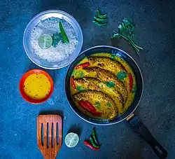 Cocina bengalí es el estilo culinario del pueblo bengalí. Tiene la única tradición de varios platos desarrollada tradicionalmente del sur de Asia que es análoga en estructura al estilo moderno de servicio a la rusa de la cocina francesa, con la comida servida por platos en lugar de todos a la vez. Los platos de Bengala suelen tener siglos de antigüedad y reflejan la rica historia del comercio en Bengala a través de especias, hierbas y alimentos. Con énfasis en el pescado y las verduras servidas con arroz como dieta básica, la cocina bengalí es conocida por sus sabores sutiles y su gran variedad de dulces y postres a base de leche. Uno encontrará los siguientes artículos en la mayoría de los platos; aceite de mostaza, pescado, panch phoron, cordero, cebolla, arroz, cardamomo, yogur y especias. La comida a menudo se sirve en platos que tienen un patrón floral distintivo, a menudo en azul o rosa. Las bebidas comunes incluyen shorbot, borjani, ghol, matha, lacchi, falooda, rooh afza, jugos naturales como akher rosh, khejurer rosh (jugo de dátiles), aamrosh (jugo de mango), dudh cha (té de la leche), taler rosh (jugo de fruta de arecaceae), masala cha (té de mezcla de especias), así como bebidas a base de semillas de albahaca o tukma.