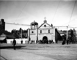 El 18 de agosto de 1814, el padre Luis Gíl y Taboada colocó la piedra angular de una nueva iglesia franciscana en medio de las ruinas de la iglesia original. La estructura completa fue dedicada el 8 de diciembre de 1822.[13] Una capilla de reemplazo, llamada La Iglesia de Nuestra Señora de los Ángeles, fue reconstruida utilizando materiales de la iglesia original en 1861. El término Reina se añadió más tarde para conciliar el nombre de la iglesia con el del pueblo.[14] La pequeña capilla, también llamada "La Placita" y la "Plaza Church", sirvió a toda la comunidad católica e inmigrante de California como la única iglesia en las cercanías de la ciudad de Los Ángeles hasta la construcción en 1876 de la Catedral de Santa Vibiana. La Catedral de Santa Vibiana se convirtió en la parroquia de habla inglesa y "La Placita" se convirtió en la parroquia de habla hispana.[15] "La Iglesia de la Plaza" sigue en pie hoy, exhibiendo los estilos arquitectónicos colonial español y gótico carpintero.