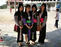 ![]() Mujeres hmong con trajes tradicionales en el mercado de Bắc Hà, Vietnam. | ||
