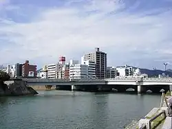 La parte más larga del puente cruza el río Ōta al norte de la isla en la que se encuentra el distrito Nakajima-cho. El trazo descendente de la “T” une el puente principal y la isla, y también es la entrada norte del Parque Memorial de la Paz de Hiroshima.