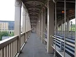 La plataforma con la barandilla está sostenida sobre los arcos por doce columnas cuadradas de 14 pulgadas (35,6 cm) separadas entre sí 9 pies 11 pulgadas (3 m). Las barras de suspensión sostenían la plataforma de la carretera, y ambas plataformas tenían dos capas de vigas de tres pulgadas colocadas en diagonal sobre vigas transversales de hierro forjado (y los soportes de los carriles en el caso de la plataforma ferroviaria).