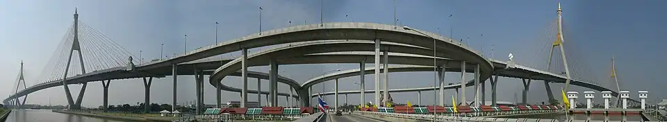El puente Bhumibol (en tailandés: สะพานภูมิพล) forma parte de los 13 kilómetros de largo la carretera de circunvalación Industrial que conecta el sur de Bangkok con la provincia de Samut Prakan en Tailandia.[1] El puente cruza el río Chao Phraya dos veces, con dos notables vanos atirantados con longitudes de 702 m y 582 m con el apoyo de dos torres en forma de diamante de 173 m y 164 m de altura. Cuando los dos tramos se encuentran, otro camino se eleva uniéndose a ellos en un intercambio de flujo libre suspendido a 50 metros por encima del suelo. El puente se abrió al tráfico el 20 de septiembre de 2006, antes de la apertura oficial de 5 de diciembre de 2006.