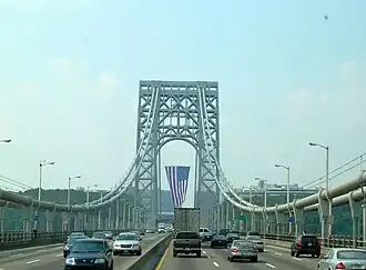 El puente soporta 14 carriles de tráfico, siete en cada dirección.[13][14] Como tal, el puente George Washington contiene más carriles vehiculares que cualquier otro puente colgante, y es el puente vehicular más transitado del mundo.[16][17][18][19] Los catorce carriles del puente se dividen de manera desigual en dos niveles: el nivel superior contiene ocho carriles, mientras que el nivel inferior contiene seis carriles.[13][14] El nivel superior se inauguró el 25 de octubre de 1931, y tiene 90 pies (27,4 m) de ancho.[20] El nivel superior tenía originalmente seis carriles, aunque en 1946 se añadieron dos carriles más.[21] Aunque el nivel inferior formaba parte de los planes originales para el puente, no se abrió hasta el 29 de agosto de 1962.[14] El nivel superior tiene una altura libre vertical de 14 pies (4,3 m), y todos los camiones y otros vehículos de gran tamaño deben utilizar el nivel superior. Los camiones están prohibidos en el nivel inferior, que tiene un espacio libre de 13,6 pies (4,1 m). Todos los carriles de ambos niveles tienen una anchura de 8 pies 6 pulgadas (2,6 m).[22][23] Los vehículos que transporten materiales peligrosos (HAZMATs) tienen prohibido circular por el nivel inferior debido a su carácter cerrado. Los vehículos que transportan HAZMAT pueden utilizar el nivel superior, siempre que se ajusten a las estrictas directrices descritas en el "Libro Rojo" de la Autoridad Portuaria.[22][24]
