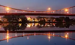 Su estructura metálica consiste en un tablero suspendido de 32 cables, cada uno de ellos compuesto de 169 alambres de acero dispuestos en capas concéntricas, arrolladas alternativamente a la derecha e izquierda con ángulo de calaje. Los cables se anclan en dos macizos de hormigón que al mismo tiempo sirven de estribos al puente y de apoyo a la viga de rigidez.