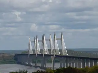 El puente mixto (carretero-ferroviario) sobre el río Orinoco es de tipo atirantado con configuración de abanico y torres en forma de H.