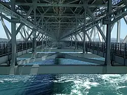 Cuando se construyó el puente, se dejó espacio para el Shikoku Shinkansen; sin embargo, no se ha avanzado en la línea del tren, por lo que el espacio destinado originalmente a los trenes bala se utiliza como un observatorio para ver los remolinos debajo de la estructura.[4]