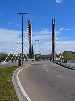 El vano principal mide 120 metros y tiene dos planos de atirantamiento, y los pilones tienen la característica especial de tener forma de un marco triangular; de forma que los tirantes, en vez de continuar hasta el contrapeso como es habitual, están anclados de forma que la carga de tracción se transmite por el lado del marco más alejado al río hasta el contrapeso.