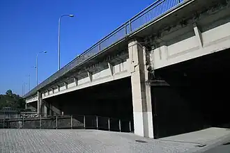 El puente de Praga cruza el río Manzanares prolongando el paseo de Santa María de la Cabeza (Madrid, España) hacia la carretera de Toledo y comunicando así los distritos de Arganzuela y Carabanchel.