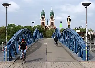 ![]() El puente, ciclistas, un marchador sobre los arcos, la iglesia del Corazón de Jesús en el trasfondo | ||