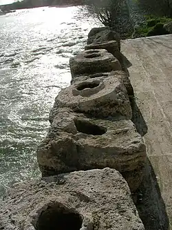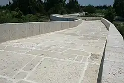 El puente está construido principalmente con bloques de piedra,[11] mientras que partes de la estructura antigua se han reutilizado, incluidas las piedras del conducto, que se construyeron en la nueva rampa.[12] Las obras de restauración a fines de la década de 1990 en el antepecho desmoronado del puente también revelaron inscripciones de piedra en griego y árabe.[9]