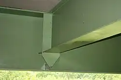 La foto de la derecha muestra el típico ensamblaje moderno entre piezas metálicas. Se trata de dos vigas de alma llena soldadas. La viga transversal, llamada "pieza puente" o "espaciador", está soldada a la pieza longitudinal, llamada larguero lateral (cuyo alma se puede ver plana en la parte inferior de la foto). Nótese también la presencia de un rigidizador vertical, que asegura la indeformabilidad del conjunto. Este rigidizador está terminado en su base por una cartela.