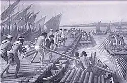 - ↑ Hoyer, 1830, En la p.406 con referencia a los puentes de pontones de unos 300 m sobre el Rin o el Danubio, además de la necesidad de utilizar molinetes con enormes tambores.