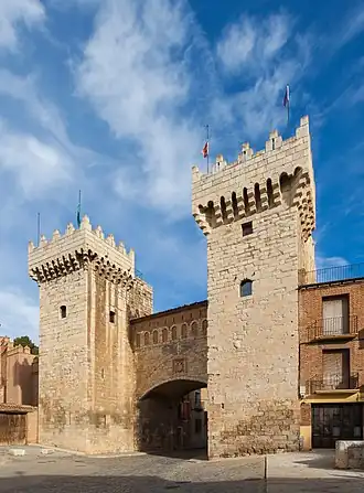 El resultado de la estructura actual corresponde a las obras realizadas en la puerta preexistente del siglo XIII y que se llevaron a cabo a partir de 1451, cuando se construyeron los dos torreones que flanquean la puerta. El del lado derecho de la fotografía corresponde a un recrecimiento de uno existente con anterioridad, mientras que el otro es de nueva construcción. Asimismo en la zona sobre la puerta se construyó la galería de arquillos de medio punto.