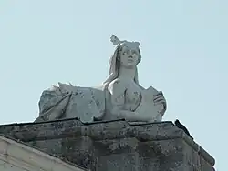Decorada con ornamentos militares y de caza en bajorrelieves localizados en los contrafuertes, sobre el frontón se alza entre banderas el escudo real, flanqueado por dos esfinges recostadas, obras llevadas a cabo por Juan Domingo Olivieri, como los hermosos jarrones de los que brota un penacho en llamas que coronan las pilastras del monumento.