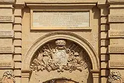 La Puerta de Mdina consta de un portal Barroco y una superestructura que sirve como puerta de entrada . El portal está decorado con pilastras dobles, los escudos de armas del Gran Maestre António Manoel de Vilhena y la ciudad de Mdina, un trofeo de armas y una inscripción en latín que dice:
