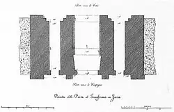 El espacio de la puerta está dividido por cuatro columnas y tres oberturas: en el centro una ancha para los coches de caballos y lateralmente dos pequeñas para los peatones.