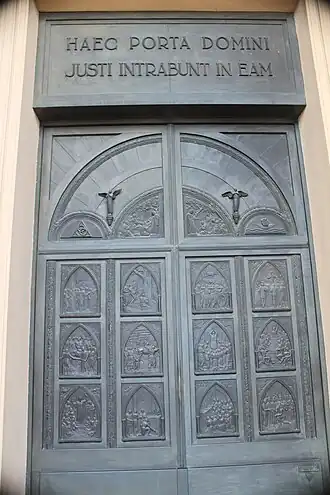 Sobre la puerta luce una inscripción latina: "HAEC PORTA DOMINI JUSTI INTRABUNT IN EAM" (Vulgata, Psalmi 117:20), que significa: "ESTA ES LA PUERTA DEL SEÑOR, POR ELLA ENTRARÁN LOS JUSTOS".