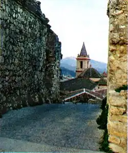 Se compone esta última de una base trapezoidal sobre la que se asienta un primer cuerpo cúbico en el que podemos apreciar una entrada en su pared frontal que debe ser el arco de entrada. También se observan cuatro ventanas, dos en la pared frontal y otras dos en el lateral norte. Sobre este cuerpo existe otro de menores dimensiones pero de igual configuración. Por último, un tercer cuerpo, cónico, más estrecho que los anteriores con cubierta abovedada culminado con lo que parece una veleta. Por tanto, nos encontramos ante una torre de tres cuerpos con entrada en el primero de ellos y que su situación espacial nos revela que es,sin duda, el denominado Arco de la Villa.