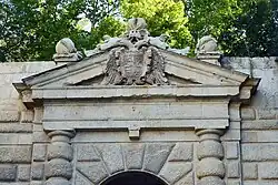 Conocida como puerta de los Gomérez hasta el siglo XVIII, recibe su nombre de las tres grandes frutas de granadas semidesgajadas y abiertas que coronan el frontón triangular de herencia clásica que remata el arco principal, y acompañan al escudo imperial de Carlos I de España y V de Alemania que se encuentra esculpido en el tímpano, junto con las figuras alegóricas de la Paz y la Abundancia, caridades que el gobierno de Carlos I prometió aportar a las nuevas tierras conquistadas al al-Ándalus. Atravesando uno cualquiera de los tres arcos de medio punto la vista se incorpora a las frondosas y llamativas alamedas del Bosque de la Alhambra, cuyo carril derecho conduce hacia Torres Bermejas, el Auditorio Manuel de Falla y el Carmen de los Mártires, mientras que el lado izquierdo, antiguamente llamado Cuesta empedrada, en su inicio nos topamos con el monolito de una Cruz devocional de mármol realizada en 1641, pasaje que nos conduce al flanco sur de la muralla de la Alhambra donde se encuentran los diferentes accesos al monumento nazarí, las Puertas de la Justicia y de los Carros. Los dos vanos laterales eran vías de acceso peatonal al bosque, no así el arco central de mayor tamaño enmarcado por semicolumnas toscanas sobre pedestal, proporciona el acceso a un vial asfaltado que se utilizaba para el transporte de vehículos públicos y privados, hoy día peatonal, calzada que conduce hasta el Palacio de Carlos V, la iglesia de Santa María de la Alhambra y el antiguo Monasterio de San Francisco, hoy habilitado como Parador Nacional de San Francisco.[2]