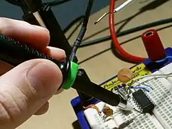 Las dos puntas de prueba que utilizan los voltímetros son por lo general una roja (para la punta positiva) y otra negra (para la punta negativa). Cualquiera de ellas puede reemplazarse por un cable con terminación de conector cocodrilo, permitiendo una conexión al punto de prueba que no necesita ser sostenido por el operador. Algunas pruebas también permiten colocar un conector cocodrilo en las extremidades de la punta, cubriendo así la punta metálica.