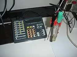 - Potenciómetría: Un potenciómetro de laboratorio (a veces conocido como milivoltímetro) también puede ser utilizado para detectar el punto final. Es un instrumento que mide el potencial eléctrico de un electrodo sumergido en la disolución. Se utilizan para valoraciones basadas en una reacción redox, pues el potencial del electrodo de trabajo va a cambiar muy rápidamente cuando se alcanza el punto de equivalencia.[8][9] Un caso particular, pero muy utilizado en las valoraciones ácido base, es el empleo del pH-metro. Este instrumento es un potenciómetro de laboratorio que utiliza un electrodo cuyo potencial depende de la cantidad de iones H3O+ en la disolución (electrodo selectivo de iones). Esto permite que sea posible medir el pH de la disolución durante toda la valoración o titulación. Al alcanzar el punto de equivalencia, se produce un cambio importante y repentino del pH medido. Puede ser más preciso que el método del indicador químico, y es muy fácil de automatizar.[2]