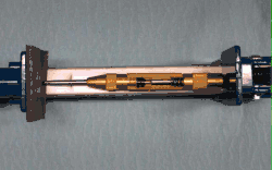 La masa del martillo está cargada por resorte desde la parte posterior del punzón mediante un gran primavera. (La compresión de precarga del muelle generalmente se puede ajustar aflojando o apretando la tapa del extremo de la parte posterior del punzón, para disminuir o aumentar la fuerza del punzón.) Un orificio detenido perforado en la parte central delantera de la masa del martillo frente al tambor actúa como un receptor para la varilla, y como un yunque para la acción del golpe.