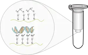 Incluso antes de los métodos de ácido nucleico que se emplean hoy en día, se sabía que en presencia de agentes caotrópicos, como el yoduro de sodio o el perclorato de sodio, el ADN se une al sílice, a las partículas de vidrio o a las algas unicelulares llamadas diatomeas, que blindan sus paredes celulares con sílice. Esta propiedad se utilizó para purificar el ácido nucleico utilizando polvo de vidrio o perlas de sílice en condiciones alcalinas.[3] Posteriormente se mejoró utilizando tiocianato de guanidinio o cloruro de guanidinio como agente caotrópico.[4] Para facilitar la manipulación, el uso de perlas de vidrio se cambió posteriormente por columnas de sílice. Y para permitir el uso de instrumentos de extracción automatizados, se desarrollaron perlas paramagnéticas recubiertas de sílice, más comúnmente conocidas como extracción con "perlas magnéticas".