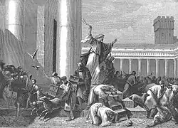 Se dice que Jesús visitó el Templo de Jerusalén, donde se describe el patio como lleno de ganado, mercaderes y las mesas de los cambistas, que cambiaban el dinero estándar de la Antigua Grecia y la Antigua Roma por shekel judío y shekel tirio. [5] Jerusalén estaba abarrotada de judíos que habían acudido para la Pascua, tal vez entre 300 000 y 400 000 peregrinos.[6][7]