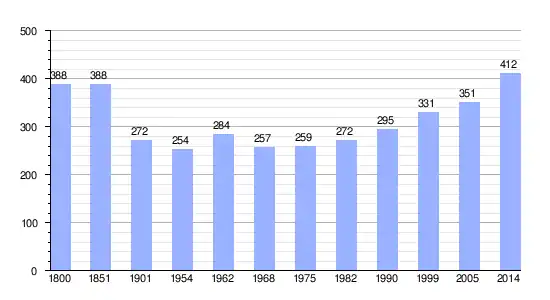 Los datos demográficos contemplados en este gráfico de la comuna de Putot-en-Bessin[4] se han cogido de 1800 a 1999 de la página francesa EHESS/Cassini, y los demás datos de la página del INSEE.[5]