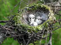 El nido del mosquetero cardenal es como una taza pequeña hecha de pequeñas ramas y materiales suaves, forrados con pelo, el borde del nido generalmente esta cubierto por liquen. Típicamente está localizado a 6 pies (1.8m) sobre el suelo, el nido esta colocado en la parte horizontal de una rama del árbol.[9] Ellos ponen de dos a cuatro (aunque tres es el número más usual) de huevos blanquecinos en un nido hecho de ramitas, tallos y raíces alineados con pelo.