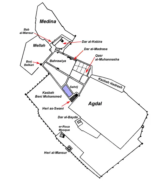 La Qasba ocupa una extensa zona más allá de los palacios principales, gran parte de la cual estaba ocupada por extensos jardines (el Agdal), campos de entrenamiento o viviendas para las tropas.[21][34] Gran parte de la zona alberga hoy barrios más recientes.