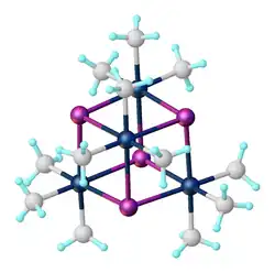 El primer compuesto de organoplatino jamás sintetizado fue el yoduro de trimetilplatino a partir de cloruro de platino (IV) y yoduro de metilmagnesio, reportado por Pope y Peachey en 1907.[6][7] El compuesto adopta una estructura similar a la del cubano con cuatro ligandos de yoduro que forman triple puente. En 1952, Henry Gilman afirmó que el "tetrametilplatino" era un derivado de este tetrámero, pero más tarde se demostró que esta afirmación era incorrecta (resultó que el "tetrametilplatino" era [PtMe3OH]4). Se han caracterizado las sales de [PtMe6] 2− y [PtMe4] 2−.[8]