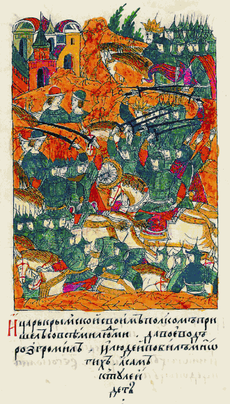 Aprovechándose así de la guerra livonia, que dejó la defensa del sur de Rusia desprotegida, el kan consiguió penetrar Rusia, llegar a Moscú y asaltar la ciudad.[2] La Opríchnina, que tenía como tarea defender la ciudad, demostró ser incompetente en defenderla y fue derrotada, obligando también al zar Iván el Terrible a huir a un lugar más seguro.[1] De esa manera el kan Devlet I Giray consiguió prender fuego a los suburbios el 24 de mayo y un viento repentino llevó luego esas llamas a Moscú, la cual se incendió. Viendo el fuego, Devlet I Giray decidió entonces abandonar sus planes de atacar el Kremlin y, después de haber tomado decenas de miles de prisioneros, regresó a Crimea.[3]