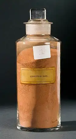 Quercitrón es un colorante amarillo que se obtiene de la corteza del roble homónimo (Quercus velutina), un árbol originario de Norteamérica. El nombre es una forma abreviada de quercicitron, del latín de Quercus, roble, y limón, y fue inventado por el Dr Edward Bancroft (1744-1821), que por ley del Parlamento En 1785 se concedió privilegios especiales en cuanto a la importación y el uso de la sustancia. La colorante es preparado por la corteza en la molienda de los molinos, después de haber sido liberado de su negro capa epidérmica, y el producto cribado para separar el fibroso tema, el fino polvo de color amarillo que sigue formando La quercitron de comercio. El naranja rojizo - decocción de quercitron contiene quercitannic ácido, de ahí su uso en curtido, y de un principio activo teñido, quercitrin, C 21 H 20 O 12 . Esta última sustancia es un glicósido, y, en solución acuosa bajo la influencia de ácidos minerales que los rendimientos quercetina, C 15 H 10 O 7 , que es precipitado, y el metil - pentosa ramnosa. Quercetina es un polvo cristalino de color amarillo limón brillante, totalmente insolubles en agua fría y la disolución sólo con moderación en agua caliente, pero muy solubles en alcohol. Por sí o en alguna forma de su glucósido quercitrin, quercetina se encuentra en varias sustancias vegetales, entre otros en cutch, en persa bayas ( Rhamnus cathartica ), trigo Hojas (Fagopyrum esculentum), Zante fustic madera (Rhus cotinus), y en rosa pétalo art Quercitron se presentó por primera vez como colorante amarillo en 1775, pero es utilizado principalmente en forma de flavina, que es el precipitado de una decocción hirviendo de quercitron y ácido sulfúrico. Químicamente, quercetina es miembro de una clase bastante amplia de colorante natural de los asuntos derivados de benzoílo fenil - pyrone o flavone, de la constitución que siguió en las investigaciones de St Von Kostanecki, A. G. Perkin, Herzig, Goldschmidt Y otros. Entre los relacionados, coloreando las cuestiones son las siguientes: chrysin de álamo yema s, apigenin de perejil, luteolin de mignonette y dyer ' S escoba, fisetin de los jóvenes y fustic amarillo ciprés, galangin de galangal root, y myricetin deNageia nagi.