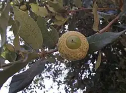 Sus hojas, perennes, tienen de 5 a 8 cm de longitud, y son de forma oblonga a oblongo-ovada, con los márgenes lisos o dentados. Las Bellotas tardan 2 años en madurar y tienen forma de platillo a cuenco con una extremidad redondeada, y de gran tamaño (copa de 20 a 30 milímetros de ancho, 6-8 milímetros de profundidad, bellota de 20 a 35 milímetros).
