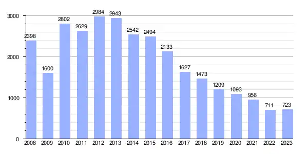 | Gráfica de evolución de la deuda viva del Ayuntamiento de Quesada entre 2008 y 2023 |