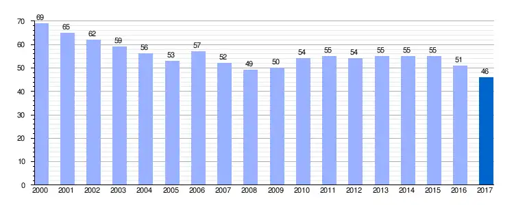 | Gráfica de evolución demográfica de Quiñones del Río[5] entre 2000 y 2017 |