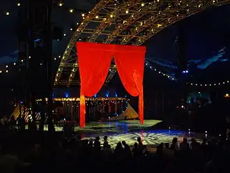 El escenario minimalista fue diseñado por Michel Crête representan una estructura monolítica como un aeropuerto o estación donde personas siempre vienen hacia adelante y atrás. El principal elemento conjunto incluye los cinco, arcos de (36.57 metros) de aluminio, 60 pies encima del escenario, conocido como el téléphérique. Estos permiten intérpretes para transportarse hacia y fuera de la escena desde arriba. Cada riel de la téléphérique tiene dos carros: uno para subir y bajar el ejecutante o equipos y la segunda para transportarlo hacia o fuera del escenario. En cuanto a la palabra escenario propio, está hecho de cubiertas de aluminio con una alfombra de goma tipo perforada. Las perforaciones, de los cuales hay más de 200.000, permiten la luz atravesar desde debajo del escenario, crear diversos efectos visuales.[1]