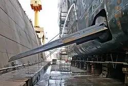 En la fotografía se observa el costado de un buque en dique seco efectuando tareas de limpieza y pintado del casco, la quilla de pantoque es la aleta de la parte inferior.